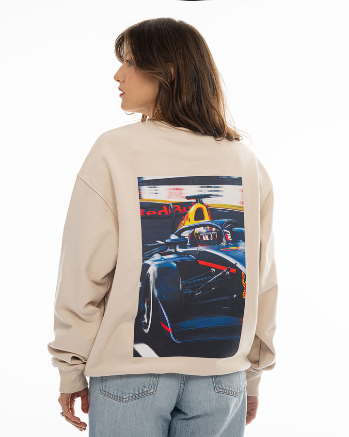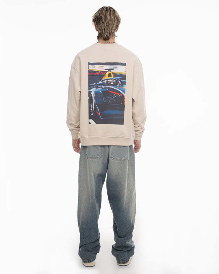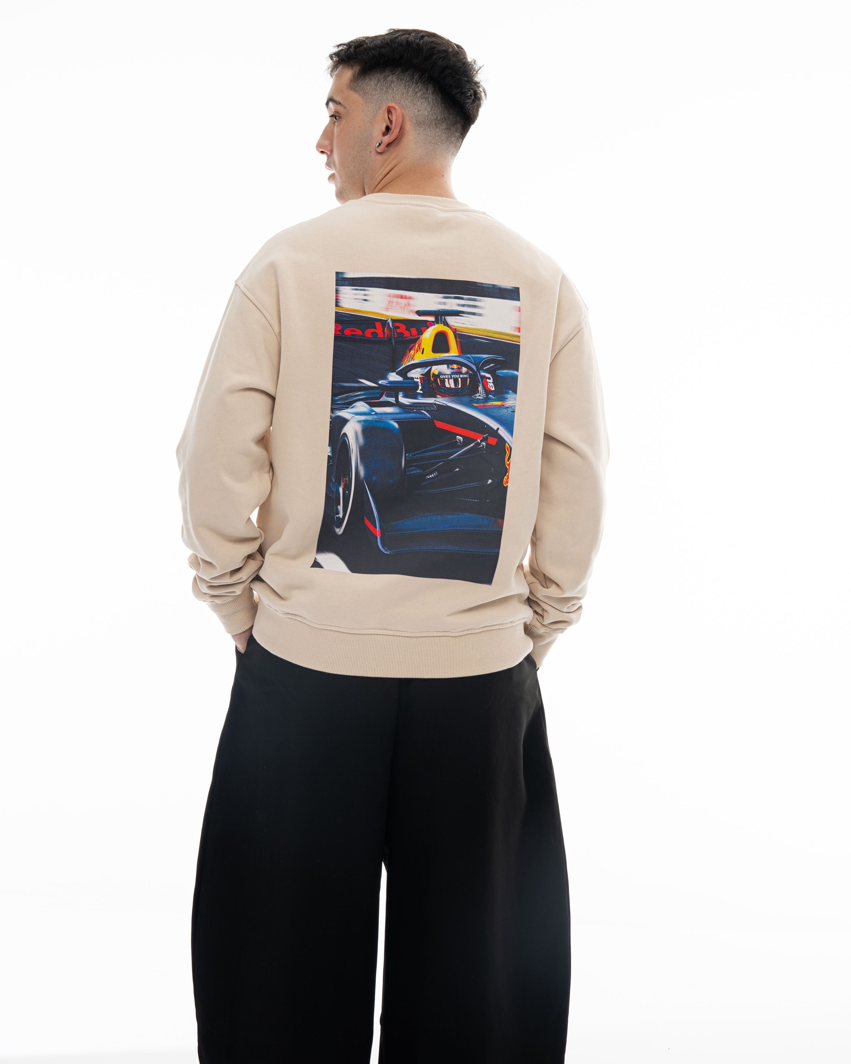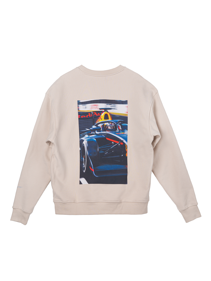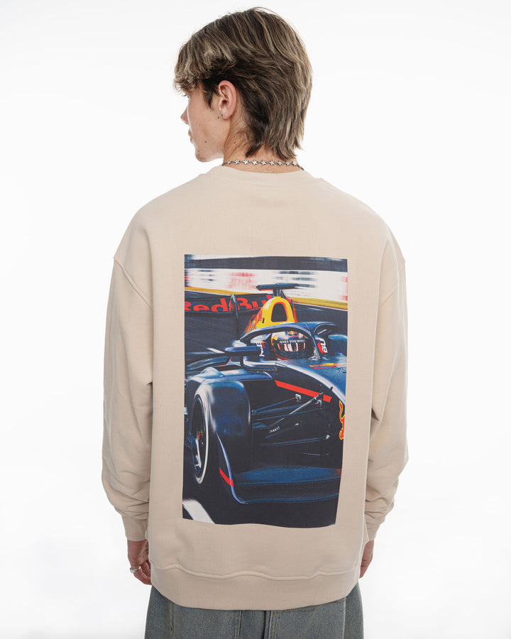 Track пуловерът представя визуален акцент в колекцията, с принт на гърба показващ Никола в болида на Red Bull Junior Team от сезон 2025 във Формула 3. Изображението добавя динамика и характер, докато предната част остава изчистена и подходяща за ежедневието. Плътната 420 GSM материя дава стабилна и структурирана форма, която стои добре и запазва силуета си.